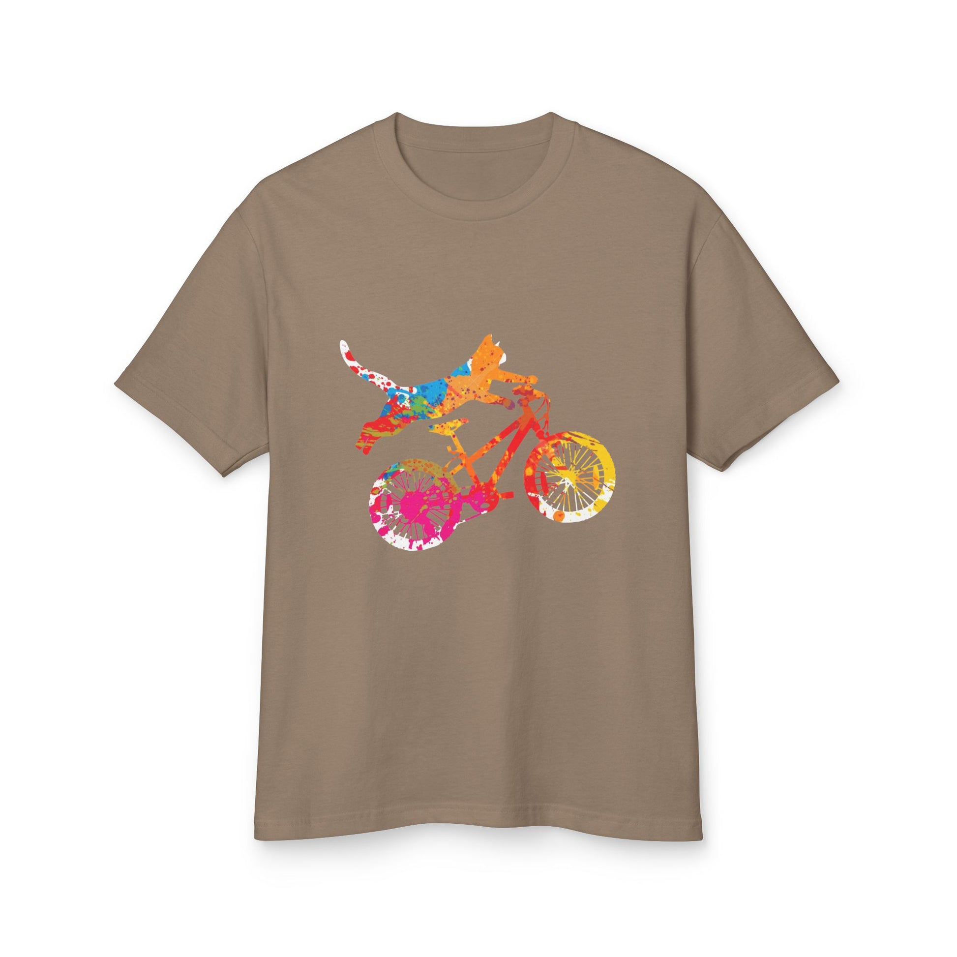 Light, lively, and a little bit mischievous — this heavyweight cotton tee carries a splash-painted fox launching off a bicycle, like a sun-drenched afternoon at the edge of town. The garment-dyed finish gives the shirt a lived-in softness and vintage texture that invites you to wear it on repeat. Thick 100% cotton and a relaxed fit make it feel substantial without being stiff; the wide rib collar and taped shoulders keep the shape while you ride, wander, or lounge. More than a graphic, it’s a small story you pull on when you want bright color and easy comfort — for weekend pedals, market runs, or a relaxed day outdoors with friends.